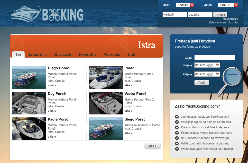 YachtBooking.com is a site for deluxe holiday seekers. YachtBooking.com provides online reservations of yachts and boats in the world, specially in Adriatic sea and Mediterranean.